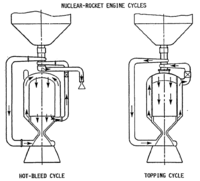 Plusieurs solutions permettaient d'envisager néanmoins le cycle amont avec un réacteur NERVA. On préconisa par exemple d'ensemencer le réflecteur avec du combustible nucléaire afin d'augmenter la température périphérique du réacteur[9]. La solution la plus citée consiste à diviser le flot d'hydrogène sortant des pompes : une partie passe dans le circuit de régénération et ne prélève à la tuyère que la quantité de chaleur indispensable à la préservation des matériaux; l'autre partie est envoyée dans le cœur du réacteur par le circuit des tubes de support du combustible[8], [10] puis vers les turbopompes, l'alimentation est alors implémentée par l'augmentation de la puissance du réacteur, sans incidence sur la poussée ou l'impulsion.